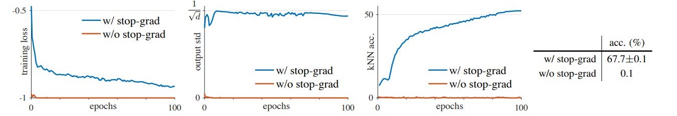 In the first plot of Figure 2 it can be appreciated how the model without stop-gradient rapidly finds a degenerated solution with an accuracy of 0.1, while using stop-gradient the model trains well. To show that the degenerated solution is caused by collapsing, the authors study, in the second plot, the standard deviation of the l_2-normalized solution output \frac{z}{\Vert z \Vert_2}, which should be zero in a collapsed case. They also show that, if the output z has a zero-mean isotropic Gaussian distribution, the standard deviation must be \frac{1}{\sqrt{d}} and the good solution is close to it.