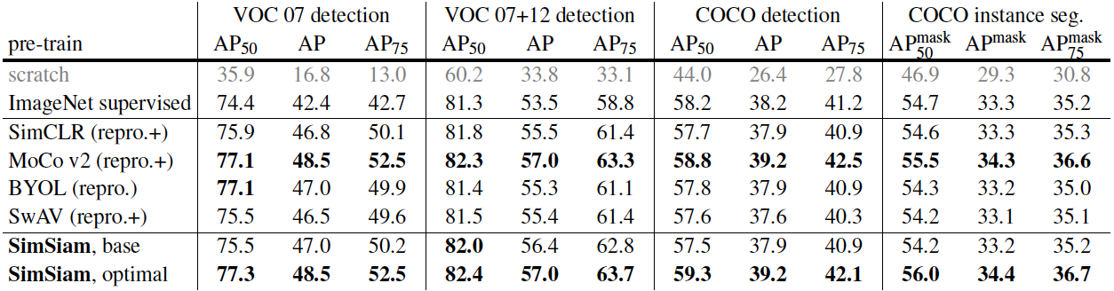 It has been also shown that SimSiam works on par with other methods in transfer learning for tasks such as VOC (object detection) and COCO (object detection and instance segmentation), as seen in Table 5.