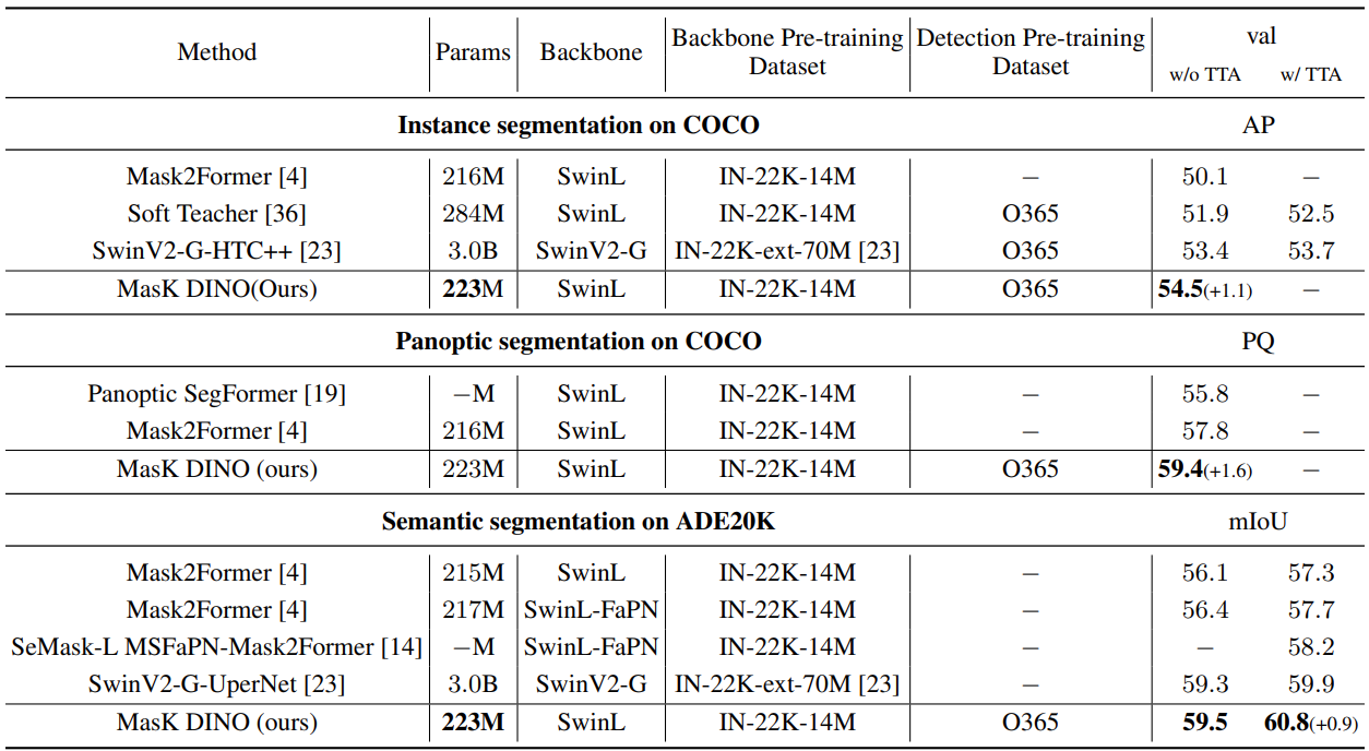 Figure 15: Mask DINO state-of-the-art results in semantic, instance and panoptic segmentation [14]. |
