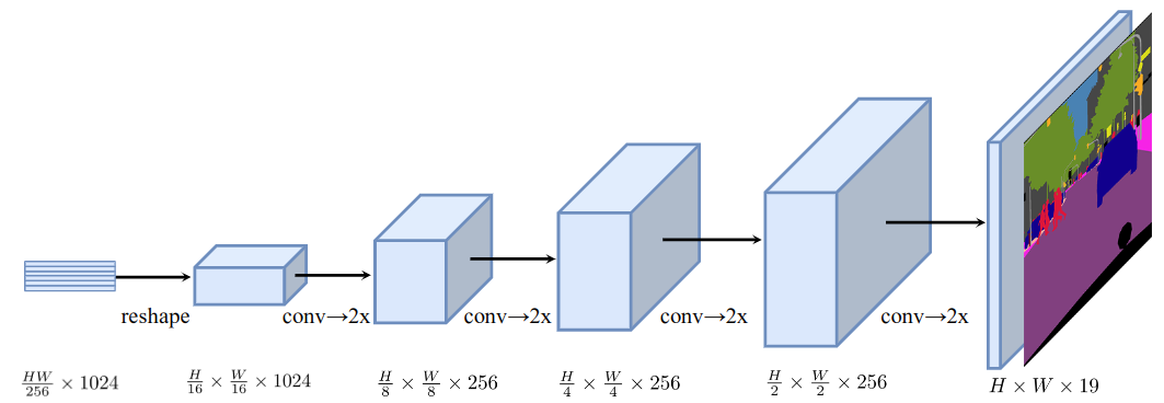 Instead of a bilinear upsampling, SEgmentation TRansformer (SETR) [27] proposes two additional decoder designs using multiple convolution and upsampling layers. Figure 8 shows the SETR-PUP decoder, using alternating convolutions and upsampling by a factor of two.