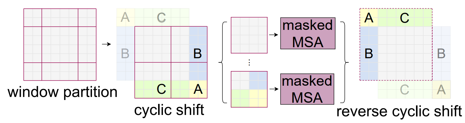 Figure 6: Cyclic shift of window partition along with masking to force the natural neighboring of 2D images [16]. |