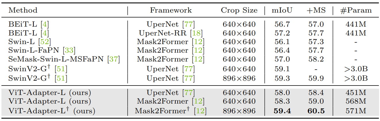 [4] Chen, Zhe, Yuchen Duan, Wenhai Wang, Junjun He, Tong Lu, Jifeng Dai, and Yu Qiao. “Vision Transformer Adapter for Dense Predictions.” arXiv, May 17, 2022. http://arxiv.org/abs/2205.08534.
