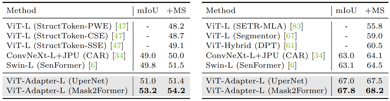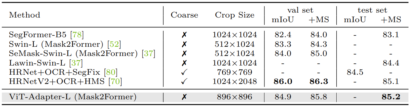 Vision Transformer Adapter (ViT-Adapter) for Dense Predictions [4] is yet another work, that adopts Mask2Former as segmentation head and yields state-of-the-art semantic segmentation results in ADE20K [28, 29] (60.5 mIoU), Cityscapes test [7] (85.2 mIoU), COCO-Stuff test [15] (54.2 mIoU) and PASCAL context [18] (68.2 mIoU) benchmarks (Figures 15, 16, 17).