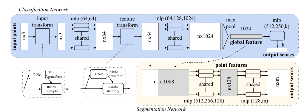 PointNet uses stacked MLP and symmetric max-pooling function to obtain global feature. Specialized network (T-net) predicts the affine transformation matrix which ensures invariance to affine transformations.