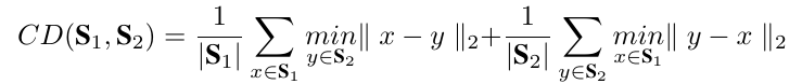Here we try to find the function from the space of partial point clouds to the space of complete point clouds that is best at approximating complete point cloud according to some distance metric. The 2 most popular distance metrics are Chamfer distance and Earth Mover’s distance.Chamfer distance is defined as follows.