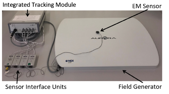 EMT (shown in figure 3) consists of 4 components, Integrated Tracking Module, Sensor Interface Unit, Electromagnetic (EM) Sensor and Field Generator. The integrated tracking module and the sensor interface units are responsible for gathering the data from the EM sensor and tracking it. However, the EM sensor can only be tracked while inside a magnetic field which is generated by the field generator.