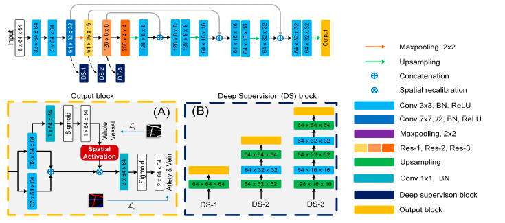A part of this network that is especially interesting for the problem of vessel segmentation is the spatial activation module. As mentioned before, vessel segmentation techniques struggle with low contrast between the vessels and background. That problem is especially problematic for capillary vessels that are crucial for the subtype vessel segmentation task. One of the methods to improve the contrast is spatial activation module introduced by C. Li et al. [3]. It uses an activation function to improve the contrast through creating an activation map.
