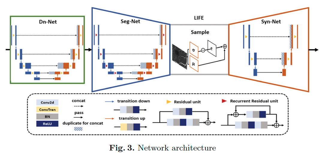 The overall architecture is composed of an U-Net [17] like denoising network (Dn-Net), segmentation network (Seg-Net), and synthesis network (Syn-Net). The input to the network is 2D en-face OCT-A image. We call that image M1. The segmentation network can be regarded as an encoder that generates a full resolution latent space L12.