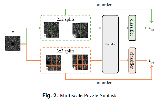 The pretext tasks in self-supervised learning can extract meaningful information from unlabeled data. Inspired by that knowledge, DCSS includes a Jigsaw like multi-scale puzzle subtask. The puzzle subtask consists of rotations and flips. The image is divided into equal pieces, either of size 2x2 or 3x3. A classification network is being trained on the puzzle that predicts which permutation was applied. The subtask is implemented in a two scale manner to consider the continuity of the vessels. Using a single scale puzzle would mean that vessels are cut at the same location, which would miss the information regarding the continuity of blood vessels. Through the usage of a 2x2 and 3x3 scales, it is ensured that the vessels are cut at different positions, helping the network understand the continuity of the vessels at the edges of the tiles.