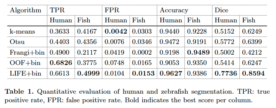 In the figure above, we can see that LIFE performed much better than the other methods when it comes to smaller branches of the vessels. Through a qualitative evaluation, we can also see that generally LIFE performed better than the traditional methods.