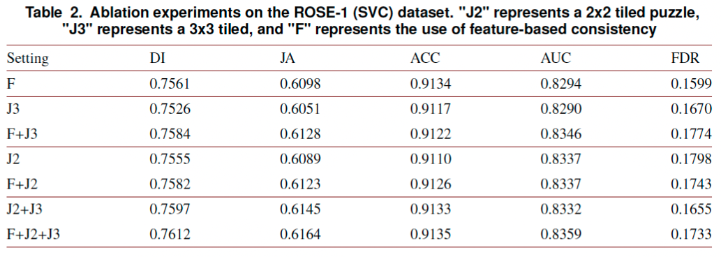 DCSS [1] model provided an extensive evaluation section. Below, we can see an ablation study. F stands for dual consistency, J2 for Jigsaw puzzle of scale 2x2, and J3 for scale 3x3. We can see that in nearly all the metrics, combination of all three techniques results in the best performance, confirming the architectural choices presented in DCSS.