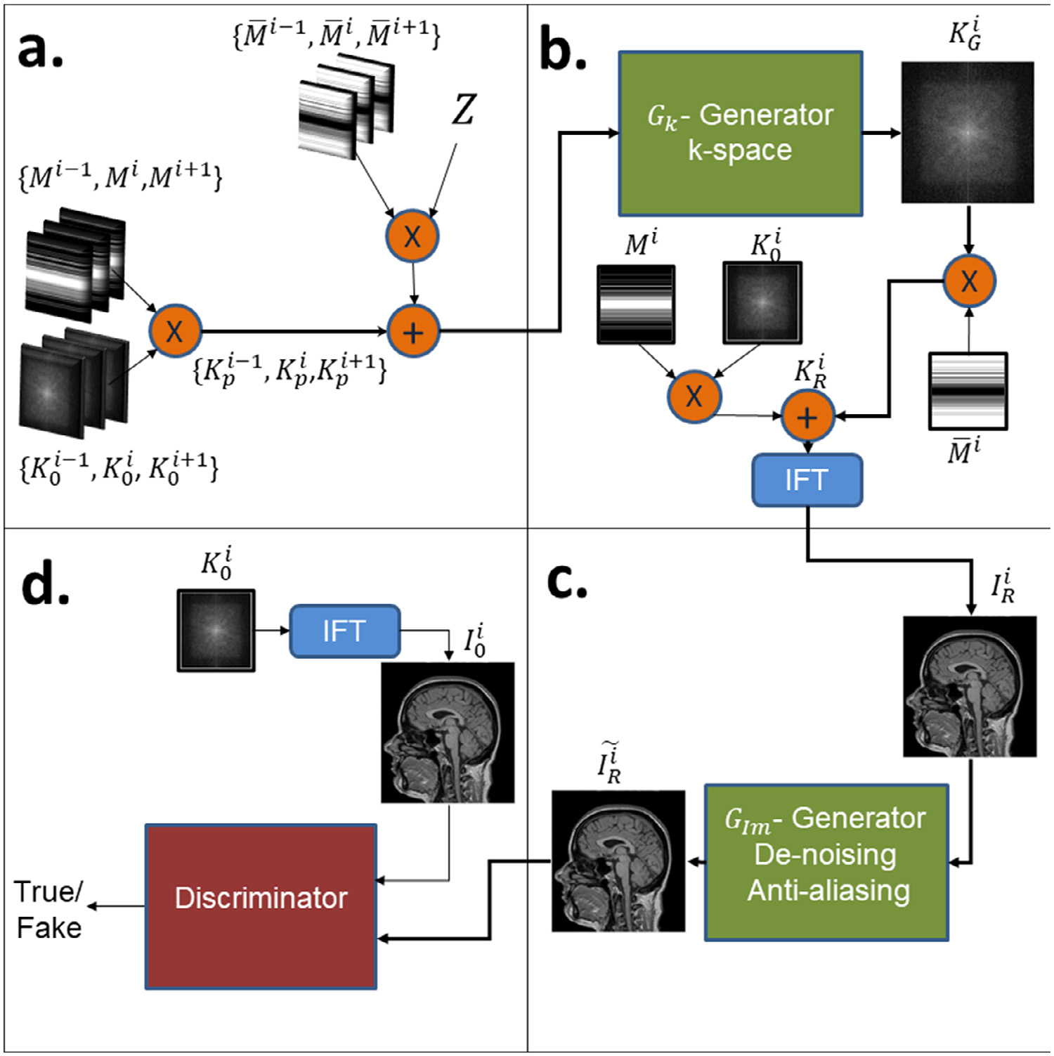 The overall structure of the network is shown in the Figure 1. The network has two generators (G_k, G_{im}) and one discriminator. As shown in part a in the Figure 1, the input of the network is three adjacent scan results in space or time, that is, the original data of K-space. In addition, each scan result is assigned a "mask matrix" (M). This matrix simulates the process of subsampling: the uncovered part uses the original data of K-space, and the covered part is filled with a random matrix Z whose elements are uniformly distributed. This subsampled K-space is input to the first generator network G_k, which generates K^i_G. Since the original data of the subsampled K-space is known, only the values of the area covered by M in K^i_G are used here, and the uncovered values are directly gained from the original K-space. After the above steps, the restored K-space K^i_R is finally obtained, and the I^i_R is further obtained after IFT. The image I^i_R is imported in the next generator network G_{im} as input, and the output image \tilde{I^i_R} and the original fully sampled image I^i_O are input to the discriminator D.