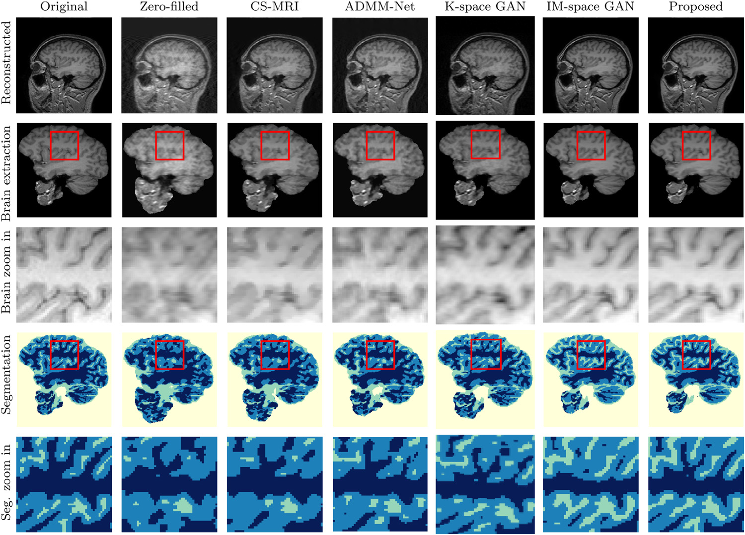 In addition, in order to show the clinical availability of reconstruction results, the authors performed lesion segmentation, which is based on a DL tool presented by Shwartzman et al [8]. The authors also provide manual segmentation as a reference (Ground Truth). A visualized result is shown in Figure 4. The quantization results in Table 5 first compare the segmentation results of the Shwartzman's tool with the GT, and then compare the segmentation results of the reconstructed image using the DL tool and the fully sampled image using the DL tool.