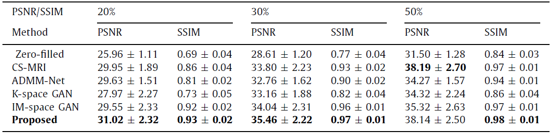 Zero-filled K-space: the subsampled K-space is directly used and the unsampled part is filled with 0. This score is used as the lower boundary of the performance.