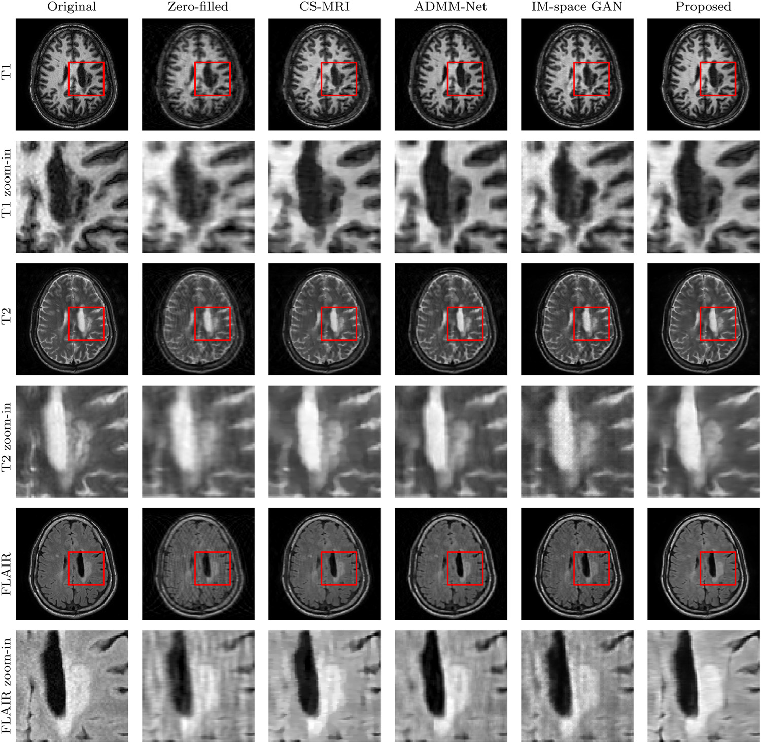 For the second dataset, the article provides the experiment results (sampling rate 20%) as shown in Figure 3 and Table 4, and provides a quantitative comparison of the whole image using PSNR and SSIM. As mentioned earlier, the dataset contains four sequences, T1, T2, PD and FLAIR.