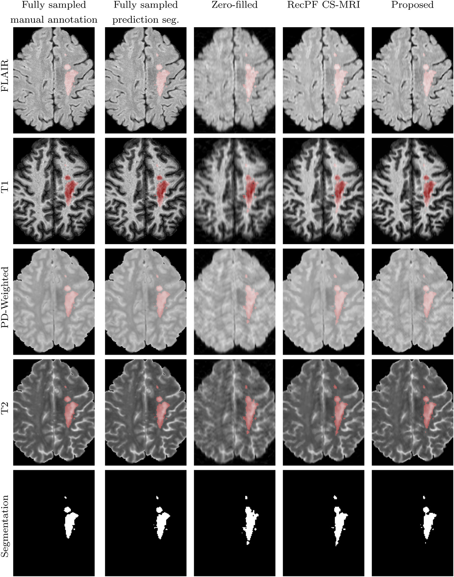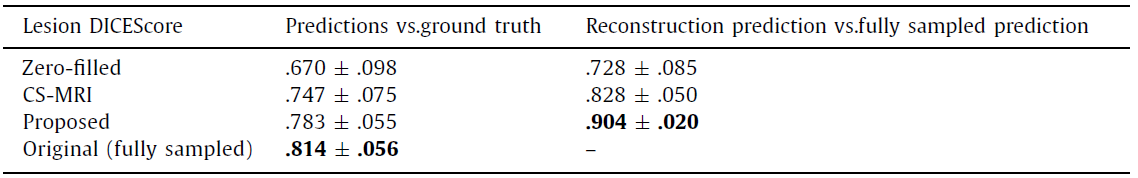 Table 5: Dice scores calculated for the lesion segmentation in reconstructed MRIs with respect to the GT and with respect to fully sampled scans