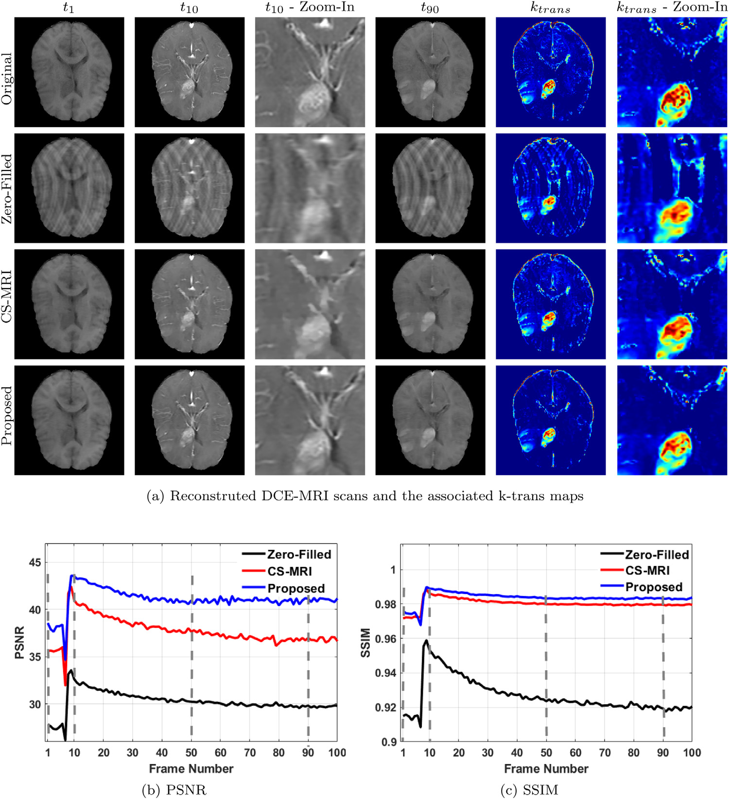 Figure 6: k_{trans} maps based on reconstructed scans and the comparison of image fidelity frame-by-frame