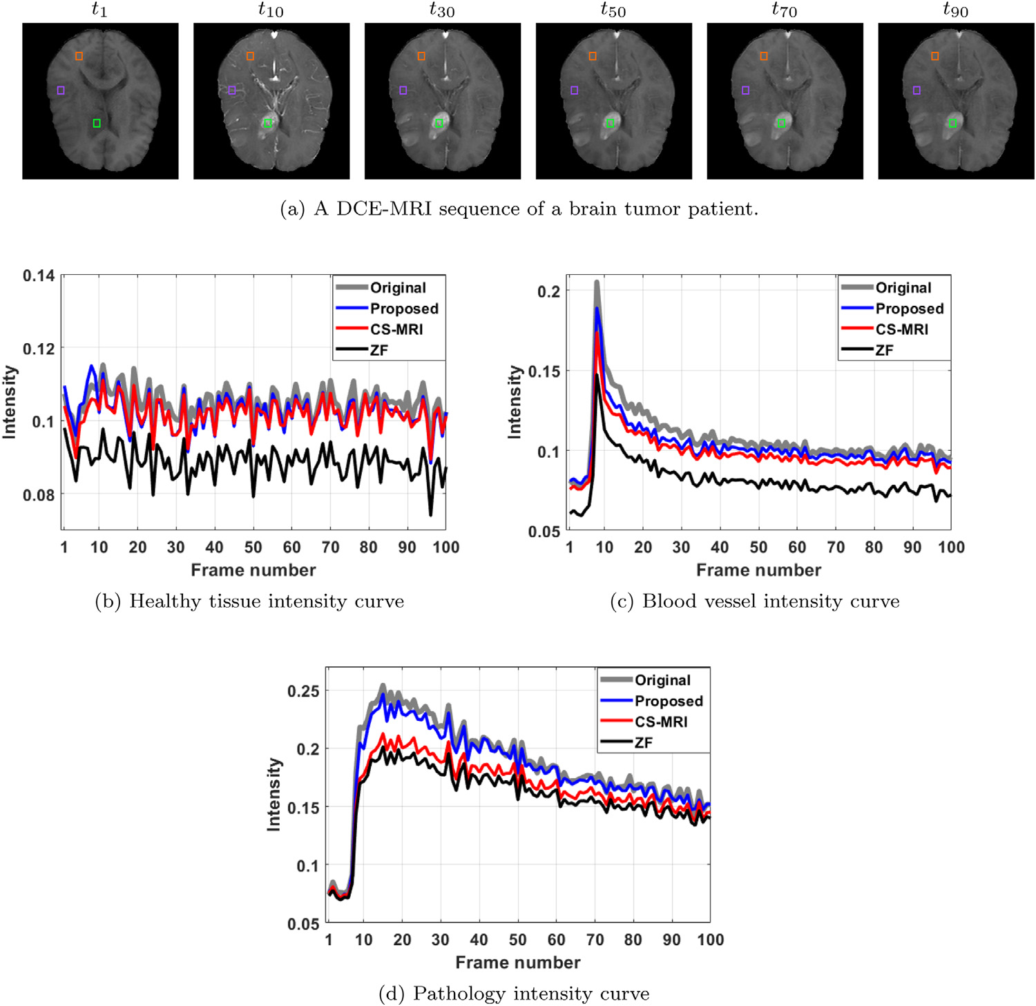 The DCE-MRI dataset contains images of patients with brain tumors and strokes, including images before, during, and after the patient was injected with a contrast agent (CA). According to the article, the CA can change the T1 relaxation time [9]. The authors demonstrated the integrity of the blood-brain barrier (BBB) by detecting the CA concentration curves at different positions (a dysfunctional BBB indicates the existence of lesions) to verify the clinical availability of the reconstructed image. The visualization is shown in Figure 5. The red, purple and green squares in (a) mark arbitrarily selected healthy, vascular, and pathological regions, respectively.