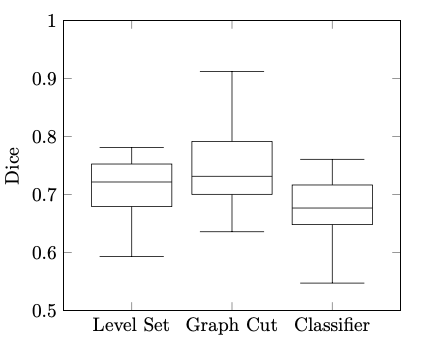 All three algorithms performed similarly in terms of accuracy with an average DC of around 0.7. Differences were noticed in the range of the DC across the sixteen samples. The level set and feature-based classifier methods had a bigger number of under- and over-segmented thyroids. This particularly happened in thin thyroids and in the area of the isthmus. Furthermore, the graph cut algorithm had the biggest range, due to its accuracy being dependent on the number of user corrections.7 Figure 3 shows the DC distribution of the three algorithms. For 3D U-Net, on a data set where their segmentation with the level set and graph cut methods had a DC of around 0.78, their 3D U-Net achieved around 0.88, a significant increase.4