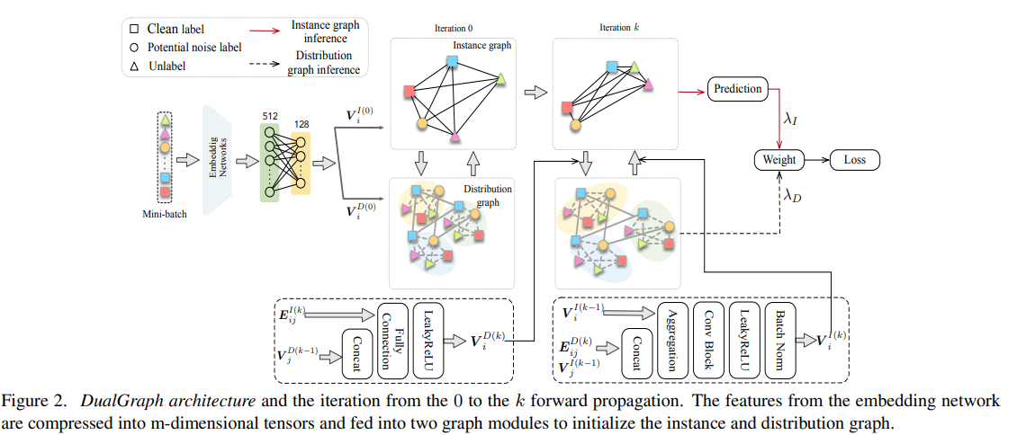 This method exploits Graph-Neural-Network to capture structural relationship among labels at 2 different levels and used the iterative optimization technique to refine the instance graph node embeddings via distribution feature embeddings captured by distribution graph. Since the distribution-level relation is robust to label noise, this network propagates distribution-level relation as supervised signals to refine instance-level similarity. Combining these two-level relations gives an end-to-end training paradigm to counteract noisy labels while generating reliable predictions.