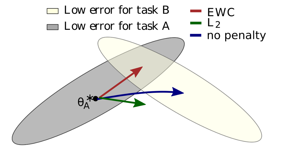 Regularization method aims to encourage or penalize the updates of individual parameters depending on their weight importance, so that it prevents the degradation of the model performance on prior tasks. Namely, Elastic Weight Consolidation (EWC) employed a concept of neurobiological theories concerning synaptic consolidation [2]. It uses the Fisher information matrix to determine the degree of rigidity or flexibility of each parameter and applies this information in updating the model for related tasks. Figure 2 shows the overview of the EWC concept. Suppose the model already learned the task A. EWC deals with learning the task B as a new task by adding regularization while not forgetting the previous task A.