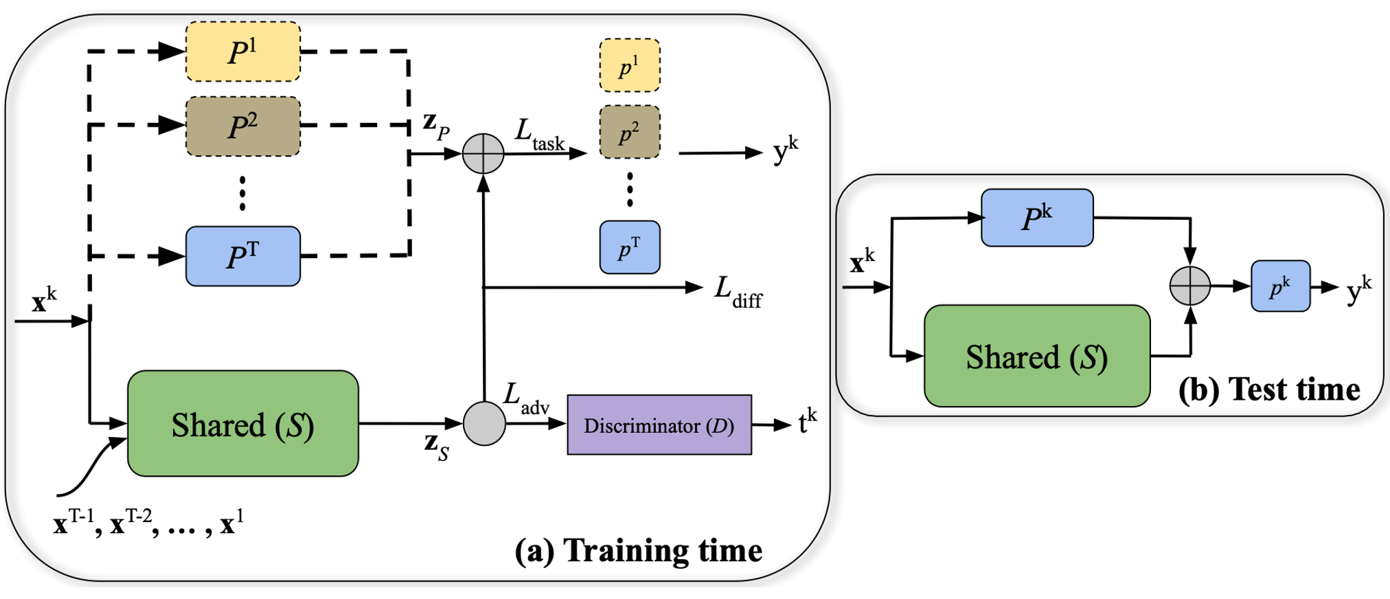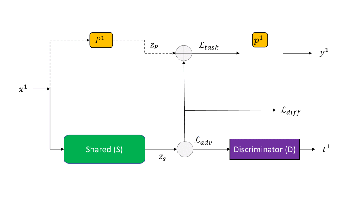 Note that training forSandD is considered finished whenS generates features thatD cannot use to predict the task label, resulting in a task-invariant representation forS. In the end, this adversarial loss enables the shared module to become as task-invariant as feasible.