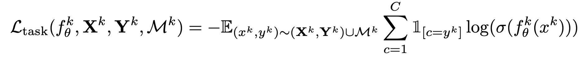 whereX^kisn sample tuples of input in the task k,Y^kis output label in the taskk,f^k_{\theta}is the classifier with factorized the private module and the shared module. {M}^kexpresses the storage of exemplars with fixed number of images. Finally, the \sigmais the softmax function. Next, of course, this paper introduced an adversarial learning method, the adversarial loss has been employed in order to conduct the min-max game between adversarial discriminatorD and the shared moduleS. The discriminator attempts to classify the input task label k while the share module tries to generate features so as to fool the discriminator. Their proposed adversarial loss function are formulated below.