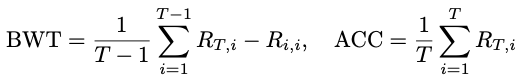 For performance evaluation for a trained model, authors used accuracy across all tasks in average. The backward transfer (BWT) was introduced to measure catastrophic forgetting. If BWT obtains a negative value, it derives happening catastrophic forgetting. Those employed metrics are shown below.