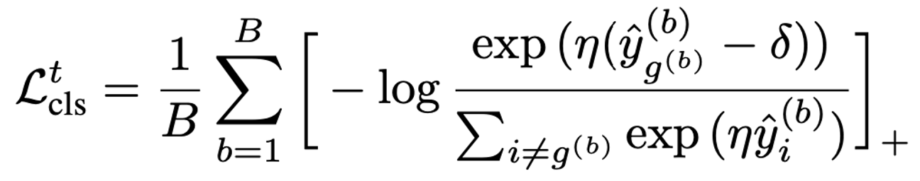 In the loss function setting for AFC, two losses were proposed. First, Classification Loss ℒ_{cls}^t is shown below.