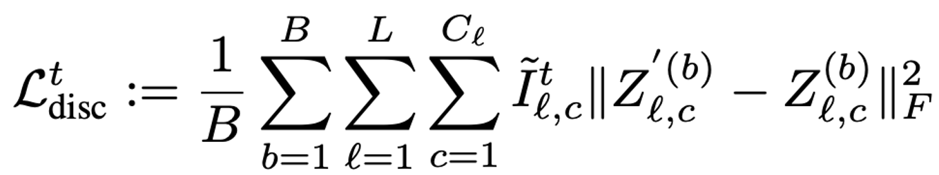 where 𝐿 is the number of building blocks, 𝐶 is the number of channels, and 𝑍_{ℓ,𝑐} denotes 𝑐^{𝑡ℎ} channel of the \ell^{𝑡ℎ} layer or block. Notably, this loss can determine the discrepancy between the previous and current network at the layer level. \widetilde{\it I}_{\ell,c}^{t} is importance across layers. It can be interpreted as a weight factor because the larger value of this map incurs the bigger changes in the loss. In the end, the total loss is formed below.