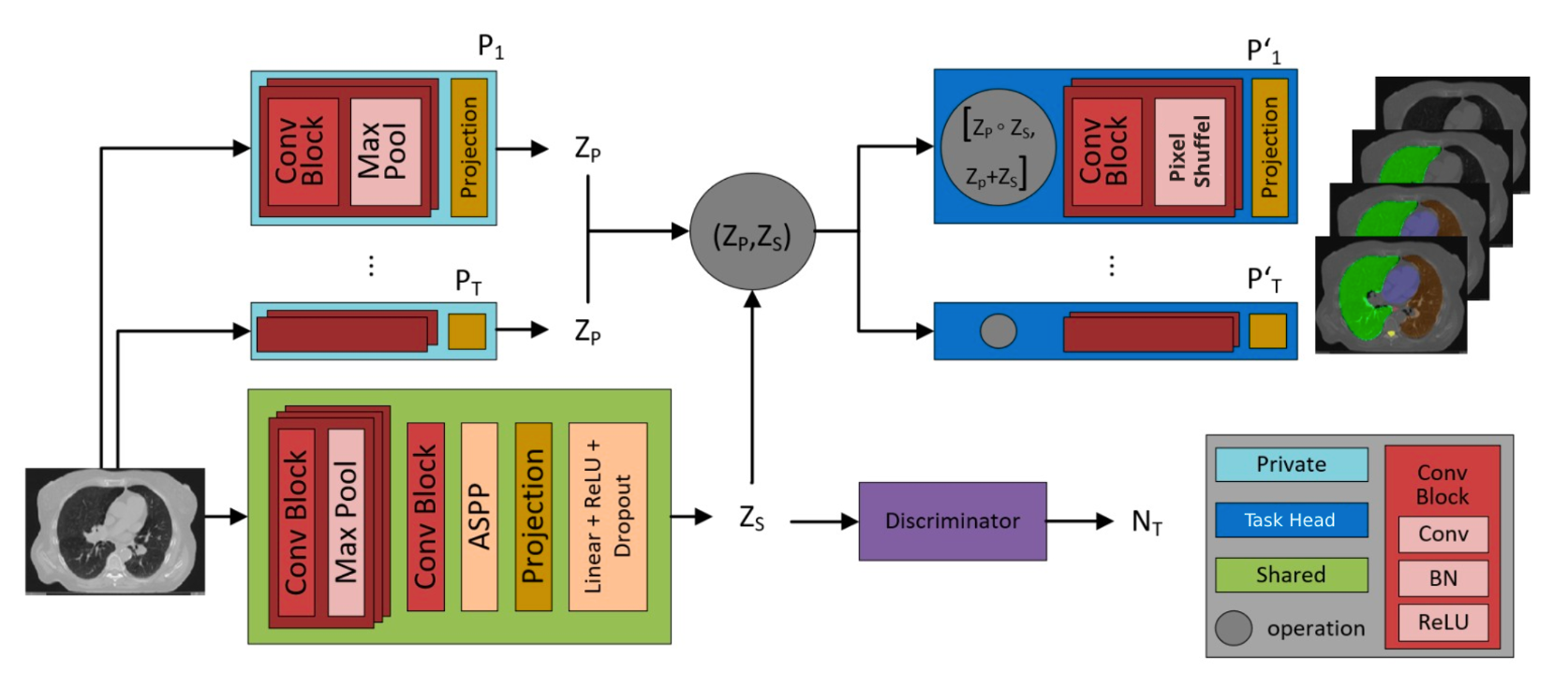 Incremental learning research is still active and has been applied to medical domains. One of the examples is Continual Class Incremental Learning for CT Thoracic Segmentation called ACLSeg [20]. This paper applied the main idea of ACL to conduct multi-organ CT scan segmentation in the adversarial training setting. There are some changes compared to the original ACL architecture to adopt segmentation tasks. First, the shared module contains Astous Spatial Pyramid Pooling (ASPP) [21], which helps to capture multi-context information at a reduced computational cost. This is desirable due to the size of medical data, and the need to segment small anatomical structures. Furthermore, instead of factorizing the private and the shared module, ACLSeg first multiplies them and those are added element-wise, finally, concatenated to be used as an input feature representation in the segmentation module P'. In addition, PixelShuffle is implemented in the segmentation module P' for upsampling. Figure 7 below represents the overview of the ACLSeg architecture.