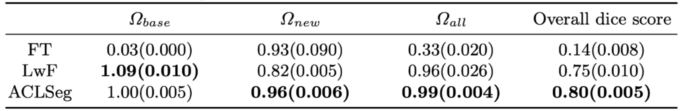 ACLSeg employs the same loss functions as those proposed in ACL. However, in order to adapt to the segmentation task, the evaluation of segmentation quality was conducted using the Dice Coefficient (DC). The author utilized the metrics proposed in the paper [22] to evaluate knowledge retention. The metric \Omega_{base} assesses the model's retention of the first learned class after subsequent learning,\Omega_{new} evaluates the model's ability to learn new classes, and \Omega_{all} measures the model's overall ability to both retain prior knowledge and acquire new information.