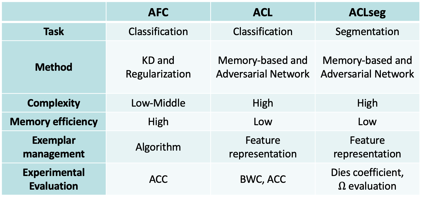 Three incremental learning models have been introduced in this blog post. ACL and AFC are both classification models, while ACLSeg is a segmentation model and an example of a medical application. The following summarizes the strengths and weaknesses of the models in comparison.
