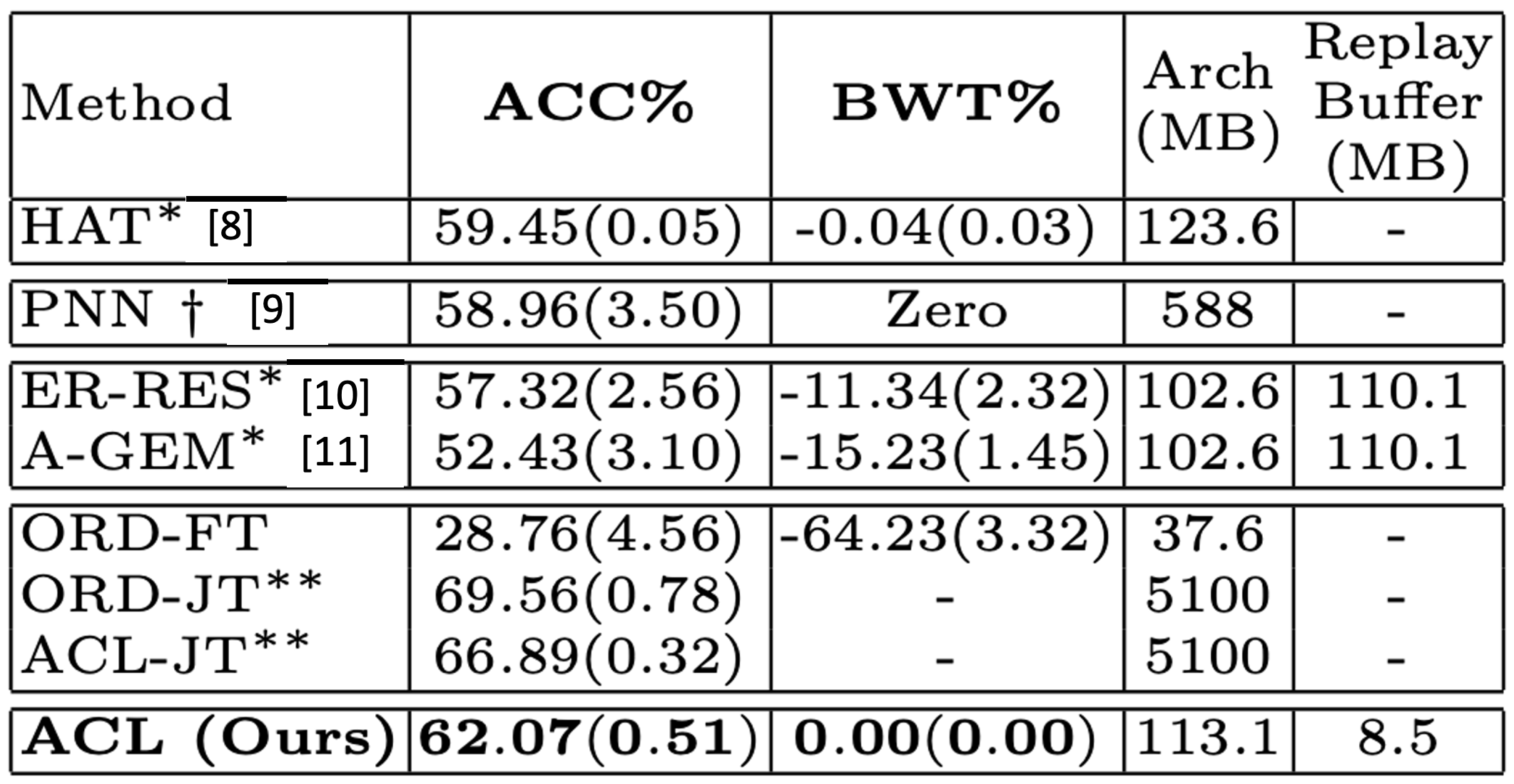 In the above setting, Table 1 shows the results of the comparison between ACL and baselines. Of course, the model with a joint training setting achieved higher accuracy compared to the ACL. However, the size of the architecture in those models becomes significantly larger due to feeding the entire dataset in each stage as the joint training settings. In terms of the performance comparison between non-joint training baseline models and ACL, ACL outperformed in accuracy as well as BWT. It indicates that ACL was capable of avoiding catastrophic forgetting. Moreover, ACL only requires one image per class, making it the most efficient in terms of memory size when compared to ER-RES and A-GEM.