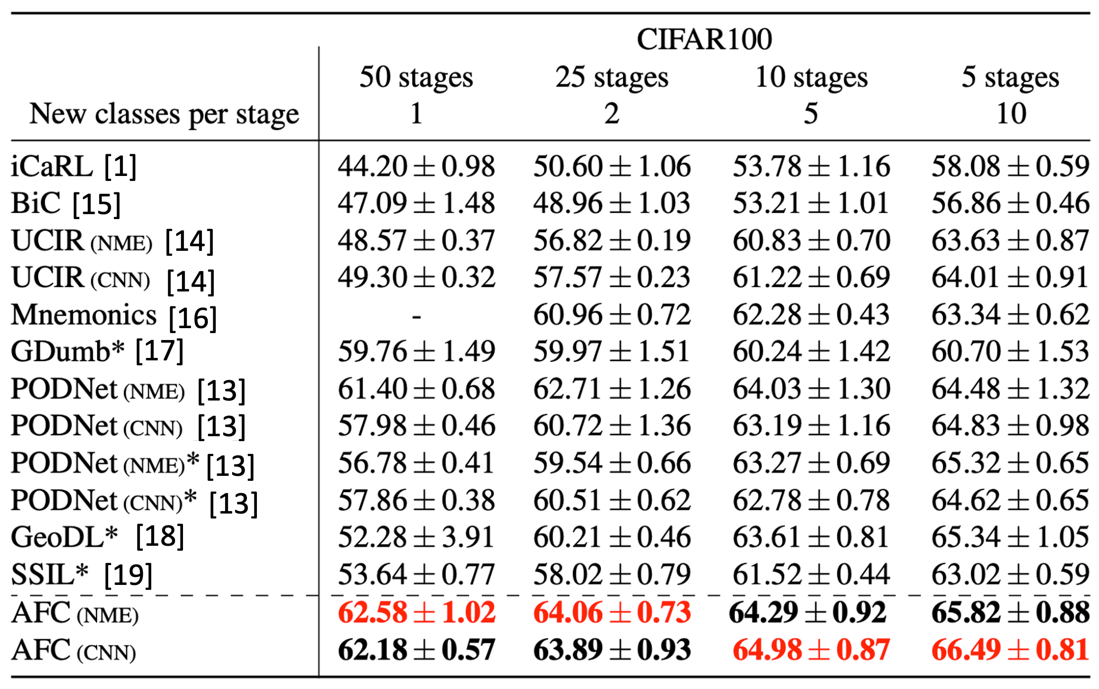 Table 2 shows that AFC outperformed other methods in incremental learning. In the 25-stage setting, ACL had the largest performance difference compared to other baseline models, demonstrating its robustness in incremental learning scenarios. NME refers to the nearest mean-of-exemplars in [1] and CNN is from [14], both being exemplar management protocols.
