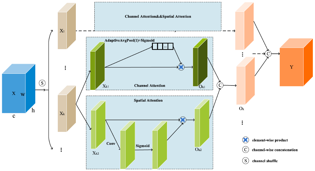 The input to the module is of size BxCxHxWxD, batch size, channels, height, width and depth, respectively. First channel shuffling is applied, which randomly mixes the channels c, then they are divided into g groups along the channel dimension. Each group is divided into two partitions, one of them is fed into the channel attention block and the other one into the spatial attention block. Afterwards everything is fused back together to have the same size as the input to the module.