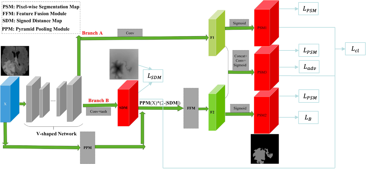 In this paper V-Net is used as a backbone. To get the segmentation map, a convolution and the sigmoid function are applied to the prediction of the Network along branch A. To get the SDM, a convolution and the tanh function are applied to the prediction of the Network along branch B.