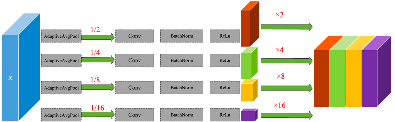 The PPM works in parallel to the Network. It is used to extract multi-scale features of the input data. It takes the same input as the network and applies four parallel pooling branches with different sizes, a convolution, batch normalization and a ReLu. In the end the branches are upsampled to the original size and spliced together. The result is multiplied with (2-|SDM|), which strengthens the contour of the segmented object.