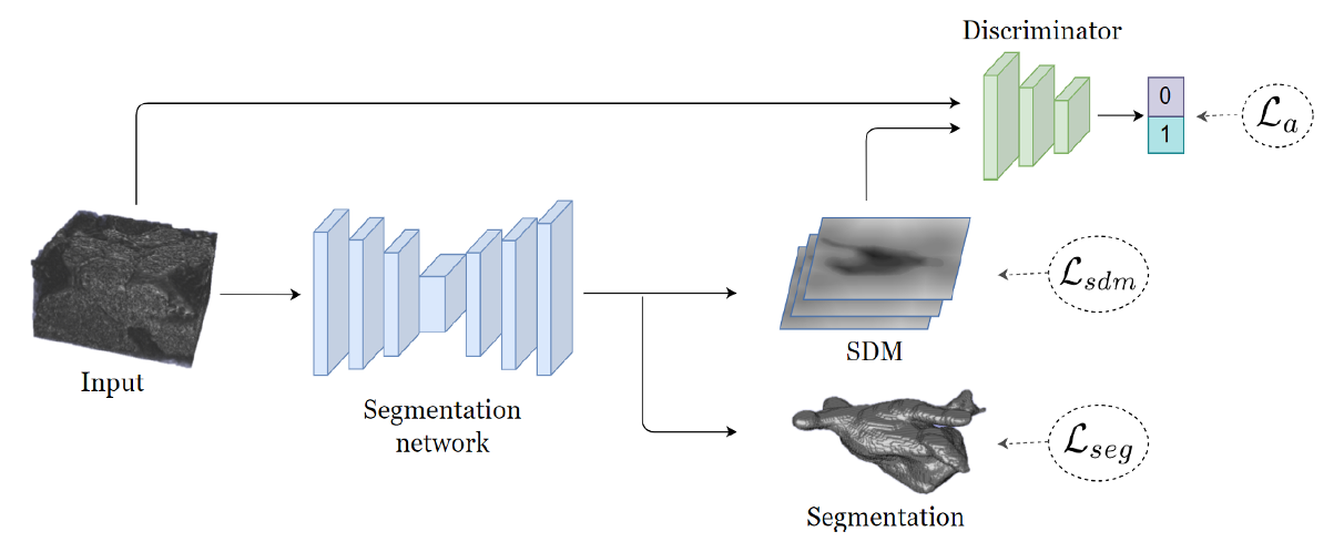 The network consists V-Net as the backbone, which jointly predicts the SDM and segmentation map. Additionally a discriminator was trained, to differentiate if it is a predicted SDM or an SDM from the labelled training data. The discriminator is trained beforehand and consists of 5 convolutional layers. It receives as input the original input and the predicted SDM.