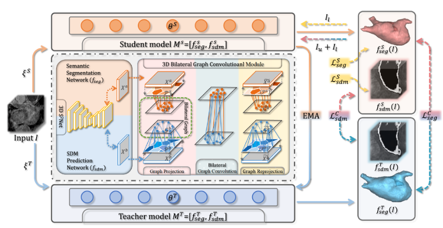 This paper uses a mean teacher architecture, where each the student and teacher network have a V-Net architecture. As post-processing they use 3D bilateral Graph Convolution, which is separated into 3 steps. First graph projection is applied, then bilateral graph reasoning and then graph reprojection.