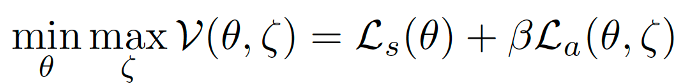 Beta is a time dependent Gaussian warm up function, which gets bigger over time. The optimization is done in an alternating manner, where first the adversarial loss is maximized and then the supervised loss minimized. The final linear loss function is given as: