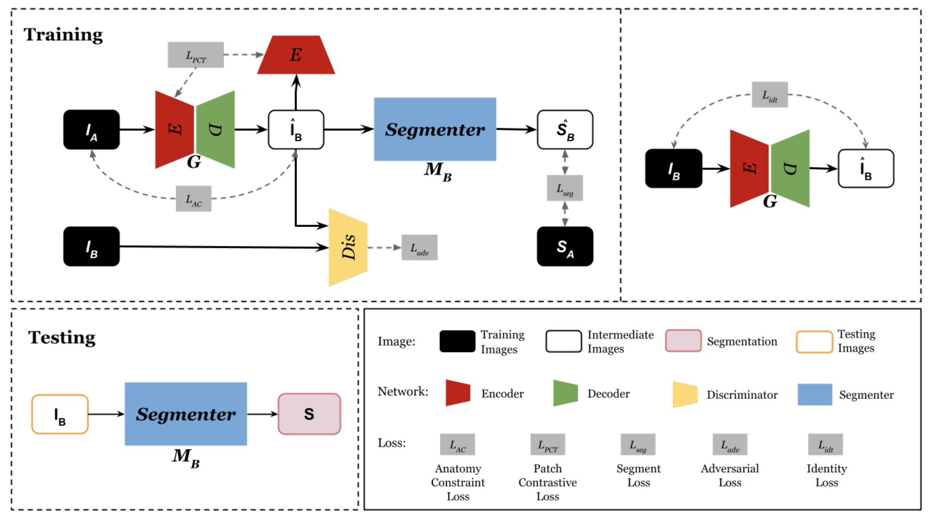 Figure 1. The proposed architecture consisting of a domain translating GAN with a anatomy-constraint and contrastive learning setting and a segmenter. Both are trained in an end-to-end setting with 5 losses. (adapted from [1])