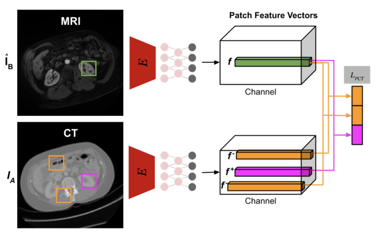 For a patch in our target domain, we find the equivalent patch in our source image as a positive sample and select other patches as negative ones. Based on this, a classification task using softmax cross-entropy (CE) is created to express the probability of selecting the equivalent patch. Finally, this is applied as further supervision of our generator to improve the association between input and output patches.