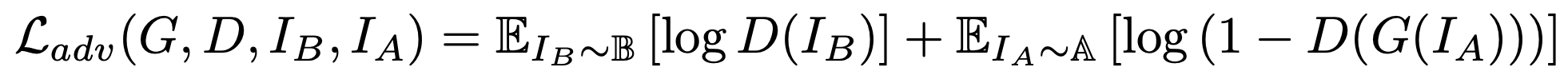 The discriminator that tries to distinguish between real images Ib and generated Images Ib^ gets supervised by the usual adversarial loss from GANs [10], where the discriminator tries to maximize the function while the generator tries to minimize it.