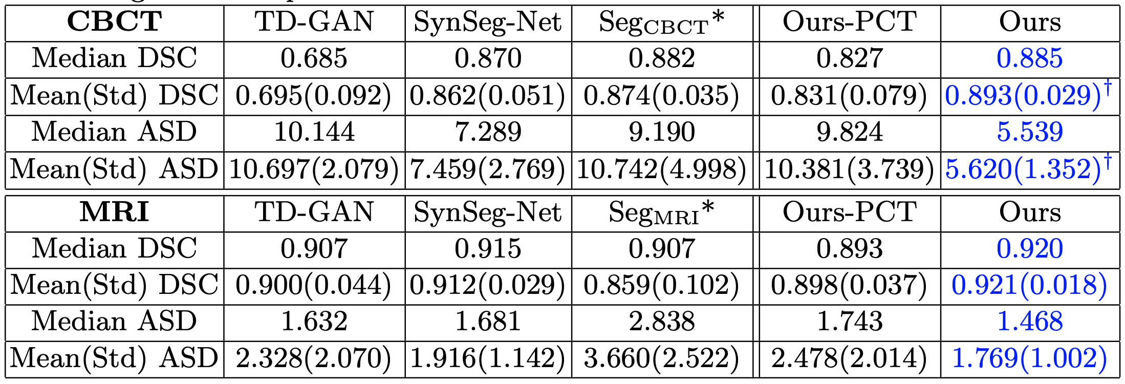 Table 1. Quantitative comparison of CBCT and MRI segmentation results. SegModality* represents the segmenter trained in a supervised fashion. The -PCT is the proposed architecture without patch-contrastive loss, as one can see using the patch-contrastive loss improves the results a lot. (adapted from [1])