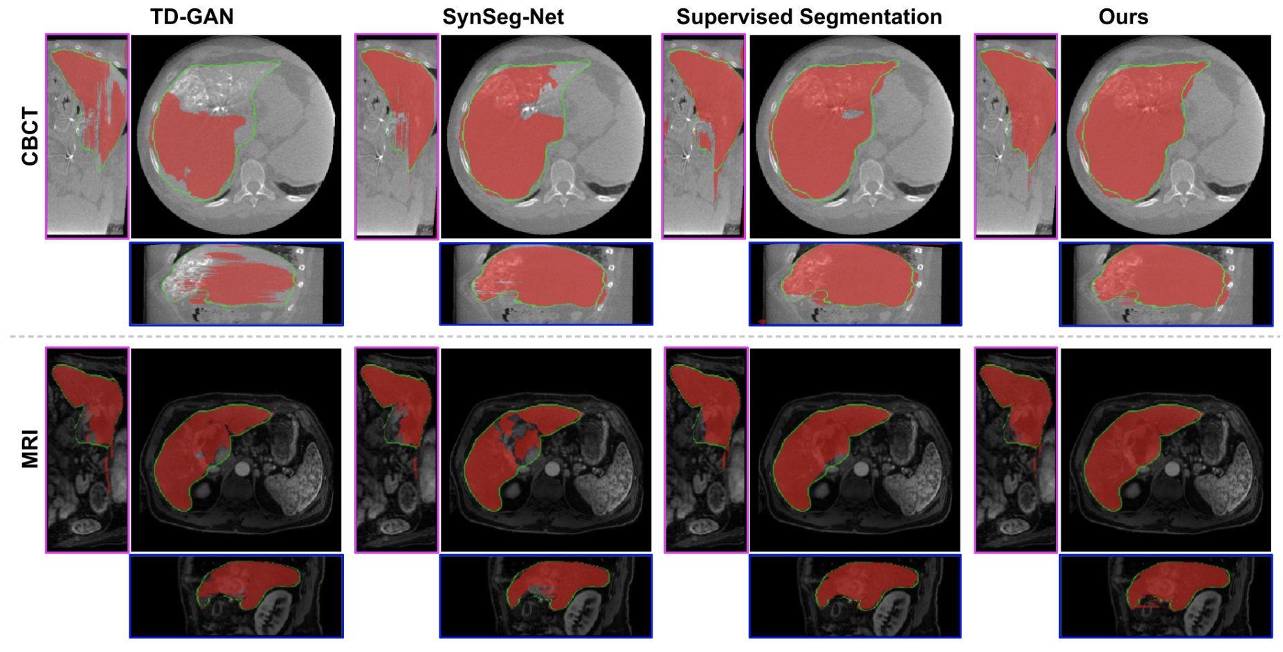 Figure. 4 Segmentation performance comparison with previous and supervised work, where the liver segmentation is marked red and the ground truth green. One can especially see that TD-GAN struggles to remove the metal artifacts during CBCT to CT adaptation. (adapted from [1])