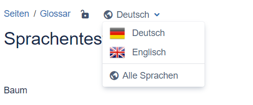 Dropdownmenü zur manuellen Auswahl der in der Seite "Sprachentest" enthaltenen Sprachen "deutsch" und "englisch"