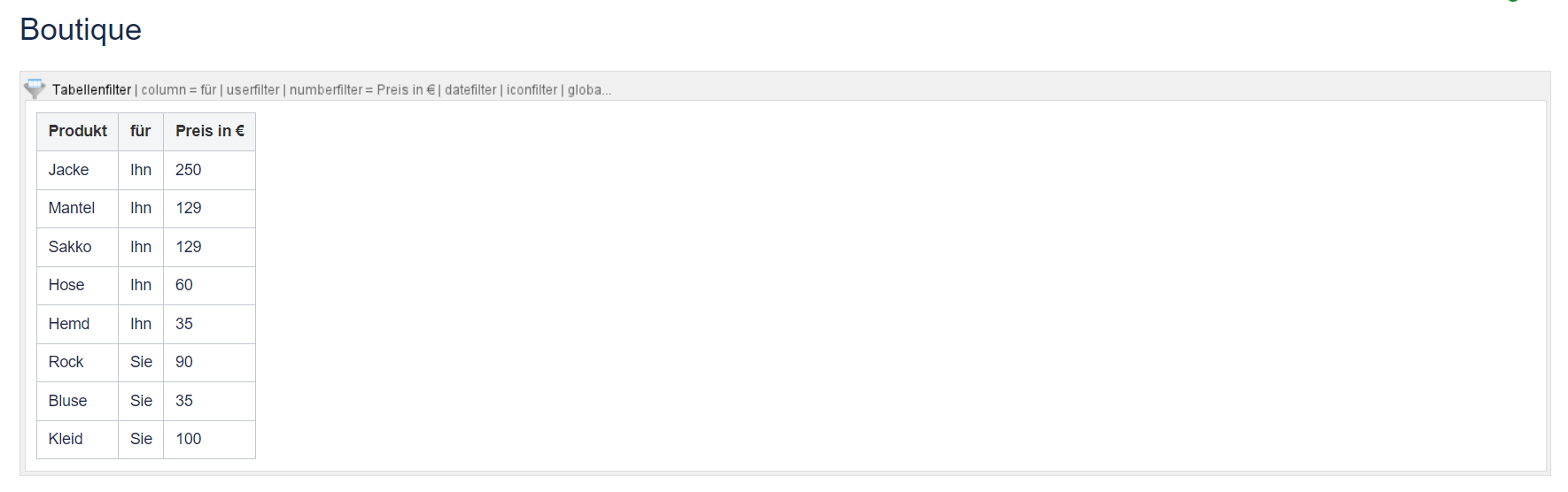 Ziel: Eine Seite "Boutique" in welcher eine Tabelle mit verschiedenen Textilprodukten für Männer und Frauen sowie Preisen enthalten ist. Gefiltert werden soll in der Tabelle nach dem Geschlecht sowie nach dem Preis in Form eines Intervalls.
