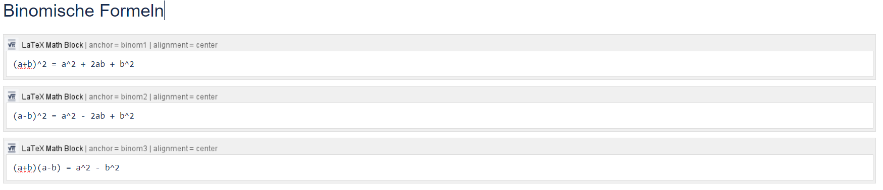 1) Schritt: Je Formel folgt das Einfügen des Makros "LaTeX Math Block" auf der Seite "Binomische Formeln".