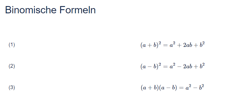Ziel: Eine Seite "Binomische Formeln" in welcher die drei binomische Formeln dargestellt sind.